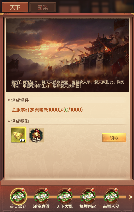 天下霸業參考史實,從黃巾起義作為賽季的開端,然後三國歸一作為賽季的結束,共製作了十個事件,記錄賽季征程的進度。它們分別是:黃天當立、漢室衰微、天下大亂、烽煙四起、南蠻入侵、攻城掠地、厲兵秣馬、群雄割據、入主中原、天下歸心。這樣可以讓各位主公具有代入感,好像身臨其境三國世界一般,在三國的世界中遨遊。