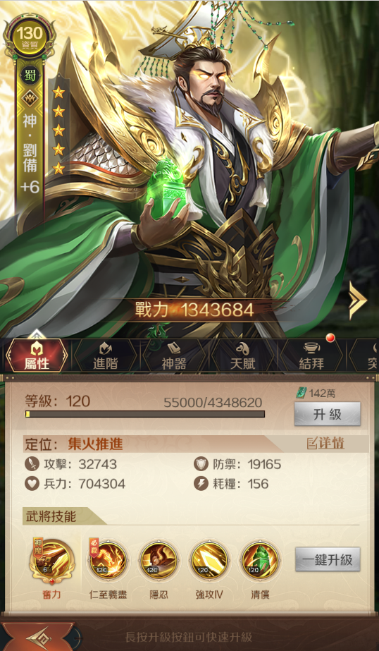 4)神器:主公等級32級解鎖神器玩法。通過消耗武將神器+不同品質的隕鐵,來升級武將的神器等級。其中神器的最大等級不可超過當前武將的等級。升級神器等級可以提高武將的各項屬性,讓您的武將所向披靡!